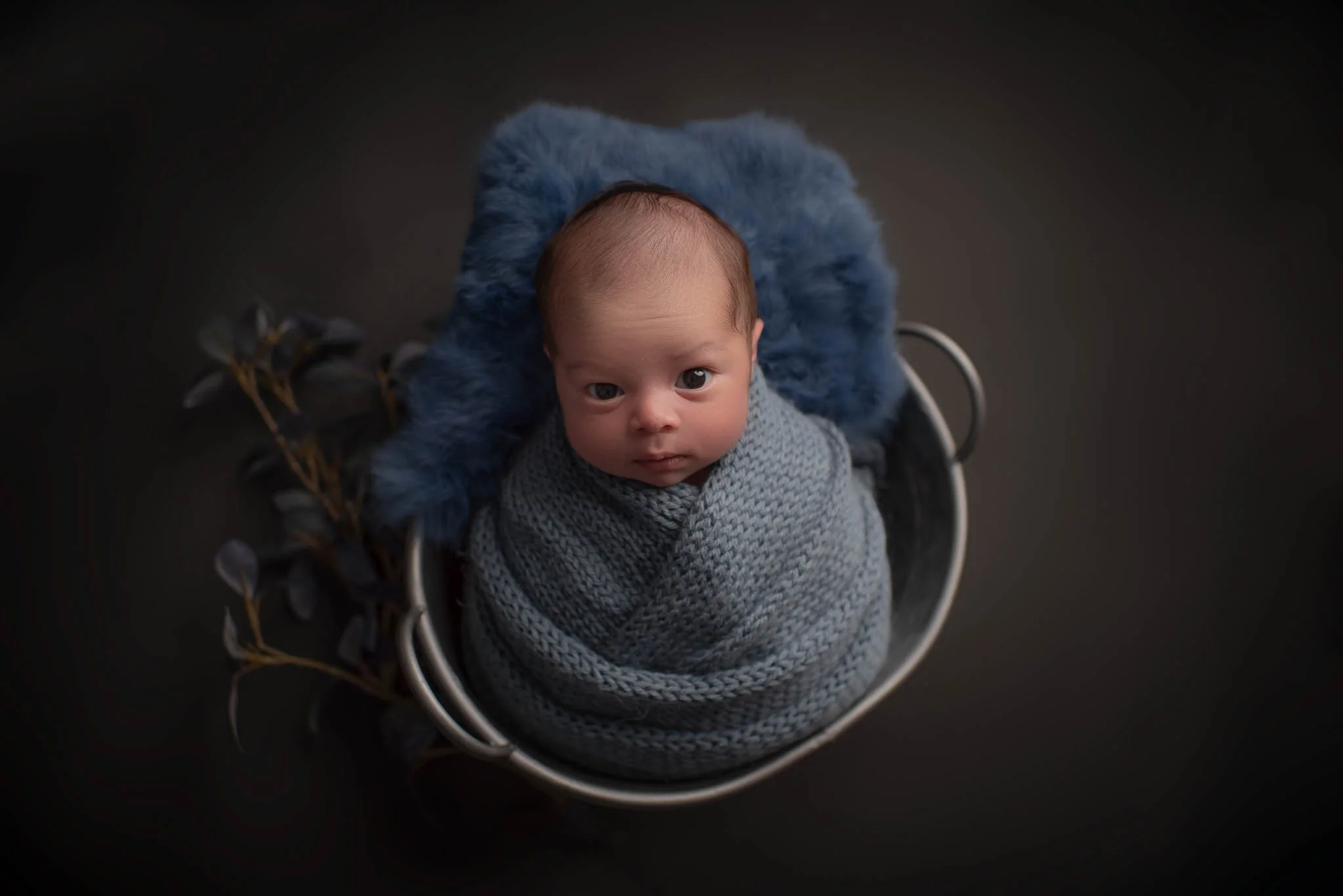 I was so excited when mom chose a blue, grey and black color scheme for baby boy’s newborn photos! I like to customize each session with your color preferences in mind. After your session is scheduled, you will fill out a newborn questionnaire to let me know of any colors or style you may currently have in your home or baby’s nursery. This baby was wide-eyed at the beginning of his session and allowed for the cutest awake poses!